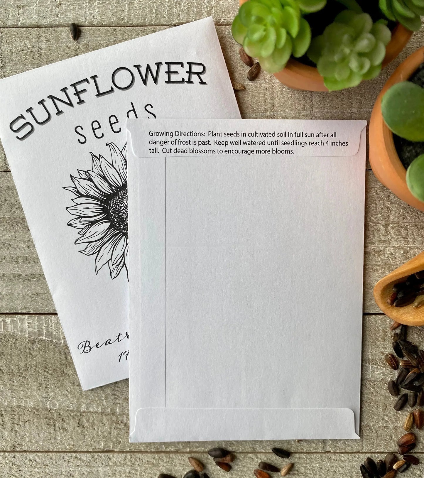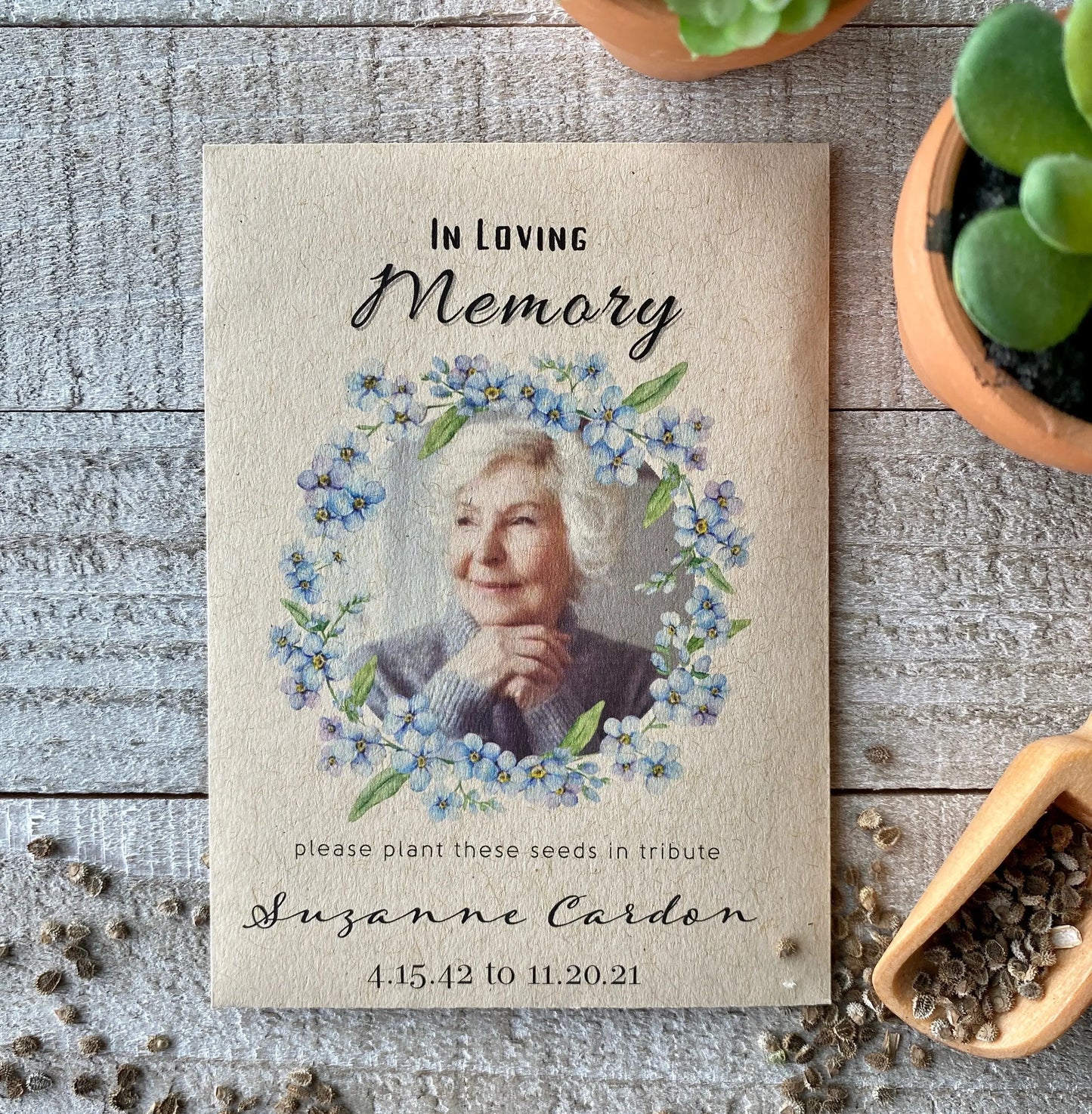 The perfect memento for a celebration of life, funeral or memorial service, our memorial packets feature symbolic forget-me-not seeds. As friends and loved ones plant and enjoy the delicate blooms of this plant, they will remember a life well lived. Each packet can be customized with text on the front and back and some allow for a photo as well.