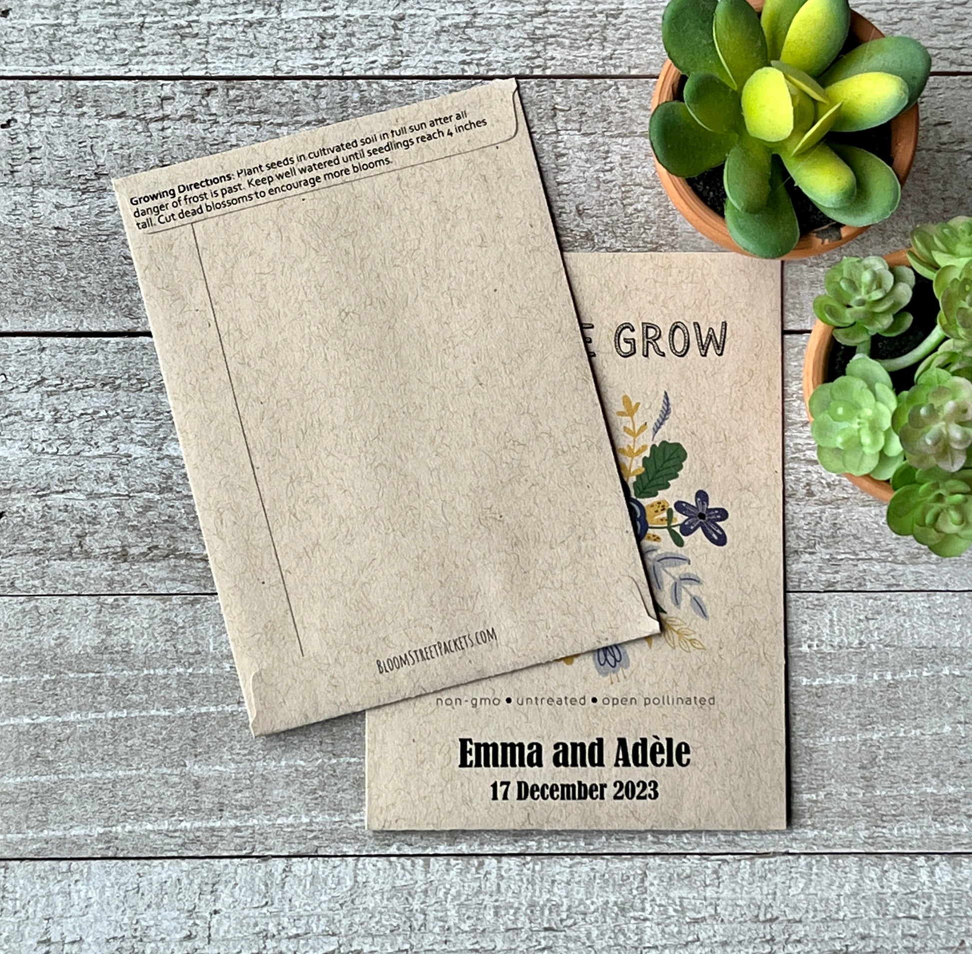 Save the bees when you give this gorgeous, earth-friendly seed packet as a favor or promotional item. Each packet comes with non-gmo, open pollinated wildflower seeds that will turn yards into bee-havens. Perfect for your wedding, bridal shower, or birthday party. Also works well for Earth Day, promotional items, or thank you gifts for customers. Order in bulk for best pricing. Each packet contains about 200-300 non-gmo, open pollinated, bee-friendly wildflower seeds. Our packets are sustainably sourced using green energy and recycled materials.
