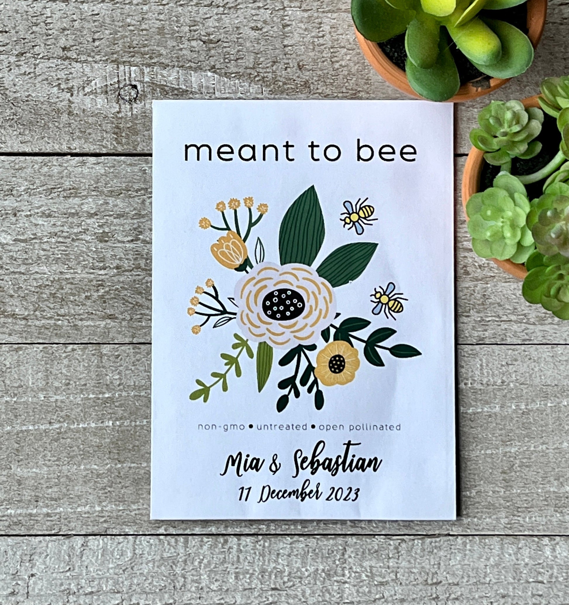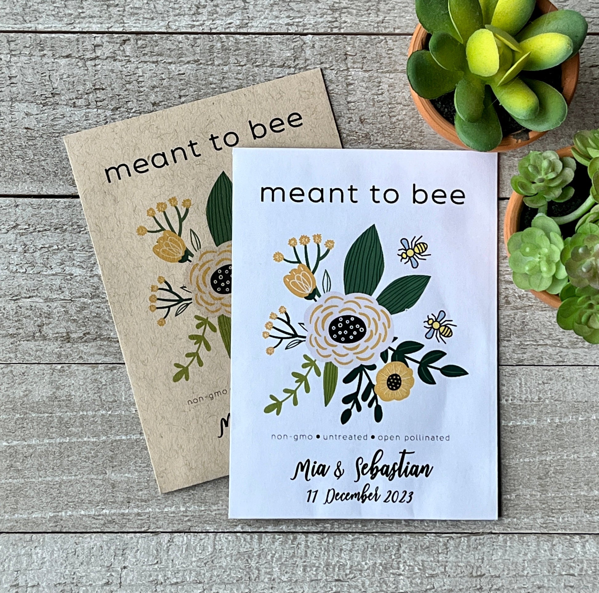 Proclaim your love to the world and help bees at the same time with this cute seed packet event favor. Each packet comes with non-gmo, open pollinated wildflower seeds that will turn yards into bee-havens. Perfect for your wedding, bridal shower, or birthday party. Also works well for Earth Day, promotional items, or thank you gifts for customers. Order in bulk for best pricing. Each packet contains about 200-300 bee-friendly wildflower seeds. Our packets are sustainably sourced using green energy and recycled materials.