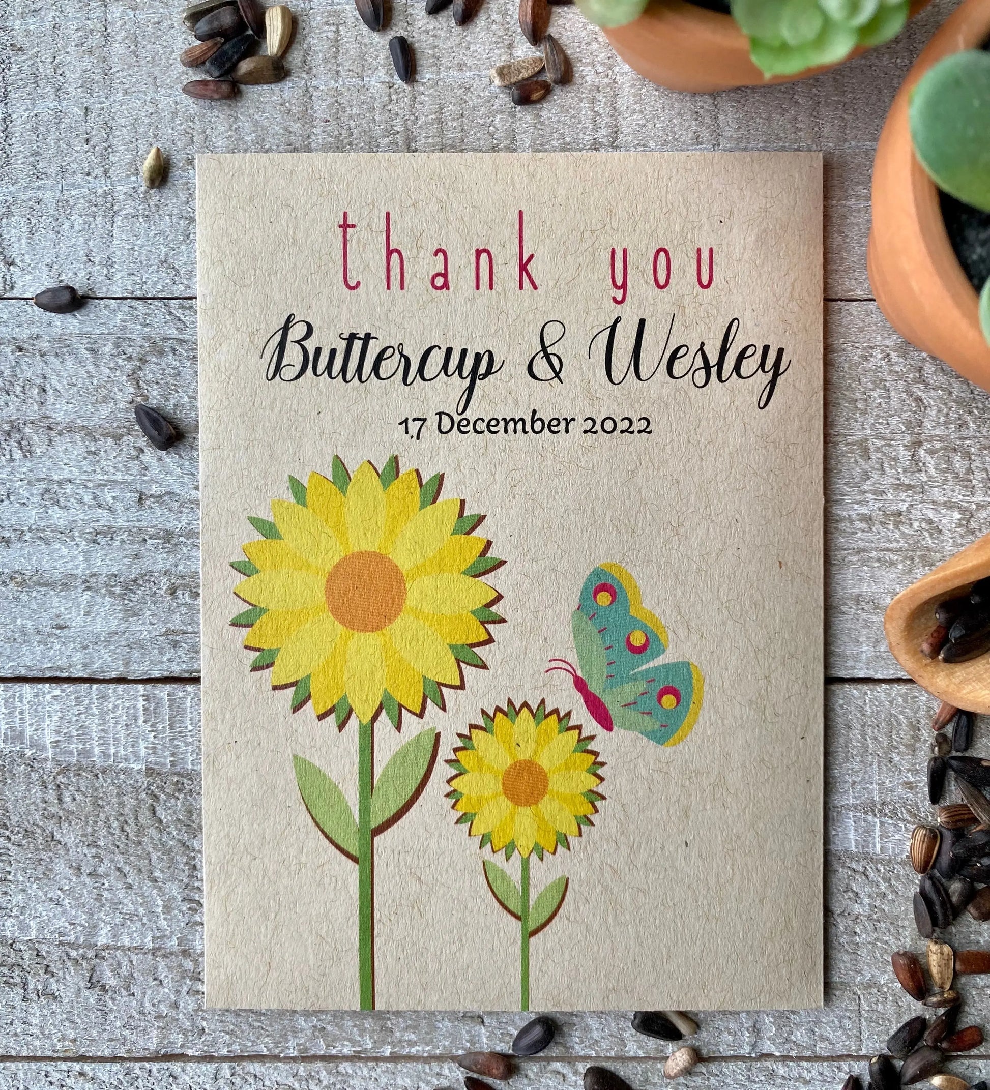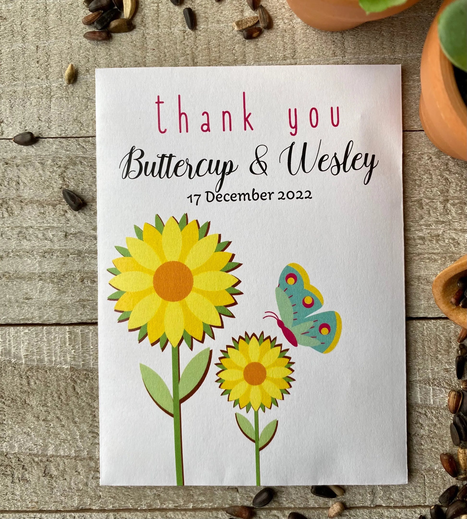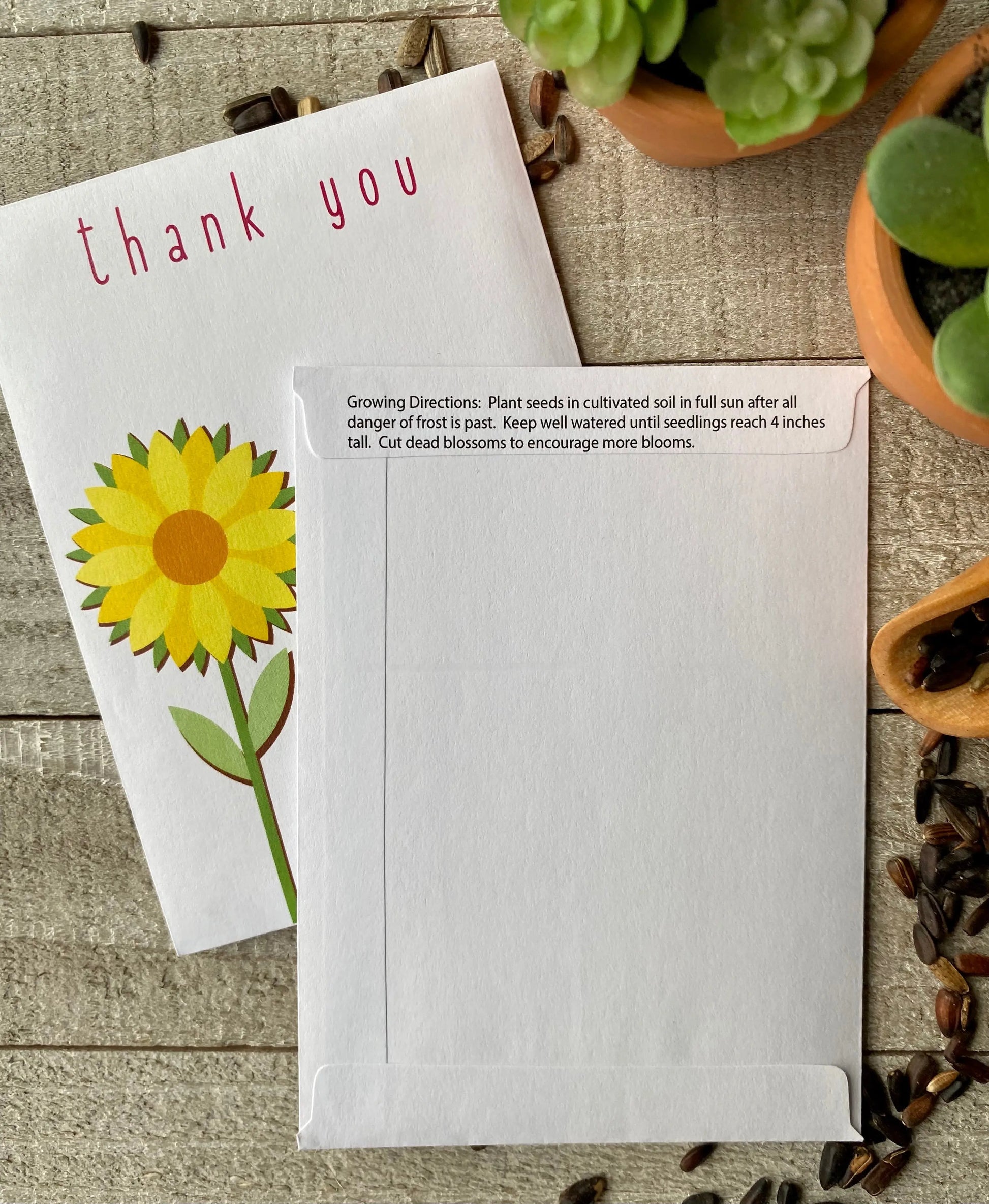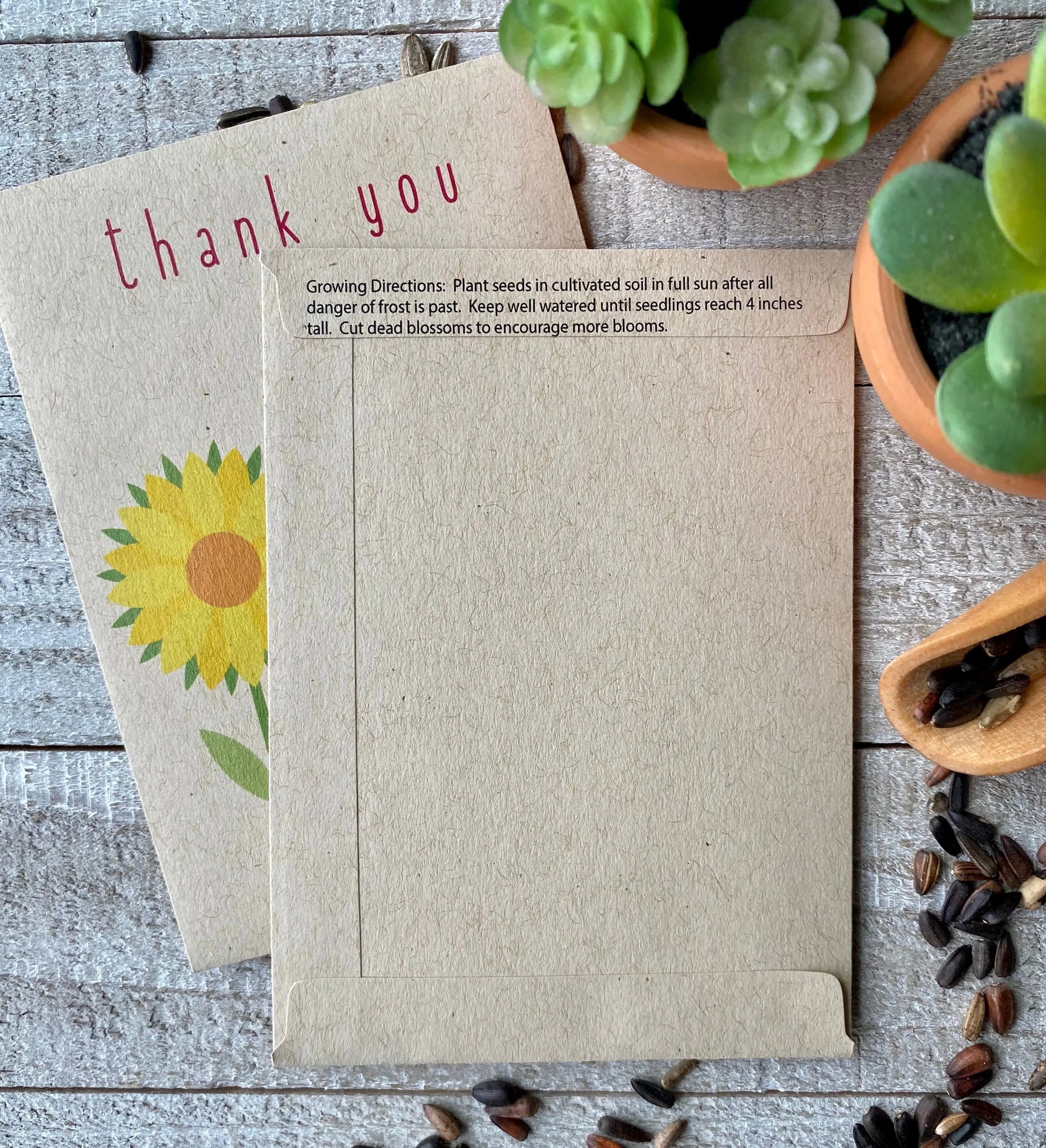 Show your playful side with this retro-inspired sunflower seed packet. Thank your wedding, shower, graduation party or corporate event guests with this fun, customizable seed packet favor. Order in bulk to save money per packet, or order as few as fifty packets, still priced competitively. Our packets are made with sustainable practices, using recycled materials and our seed is non-gmo, open pollinated, and bee friendly. Personalize with your information on the front, or front and back. There's even room on the back for a logo, artwork or your own photo.
