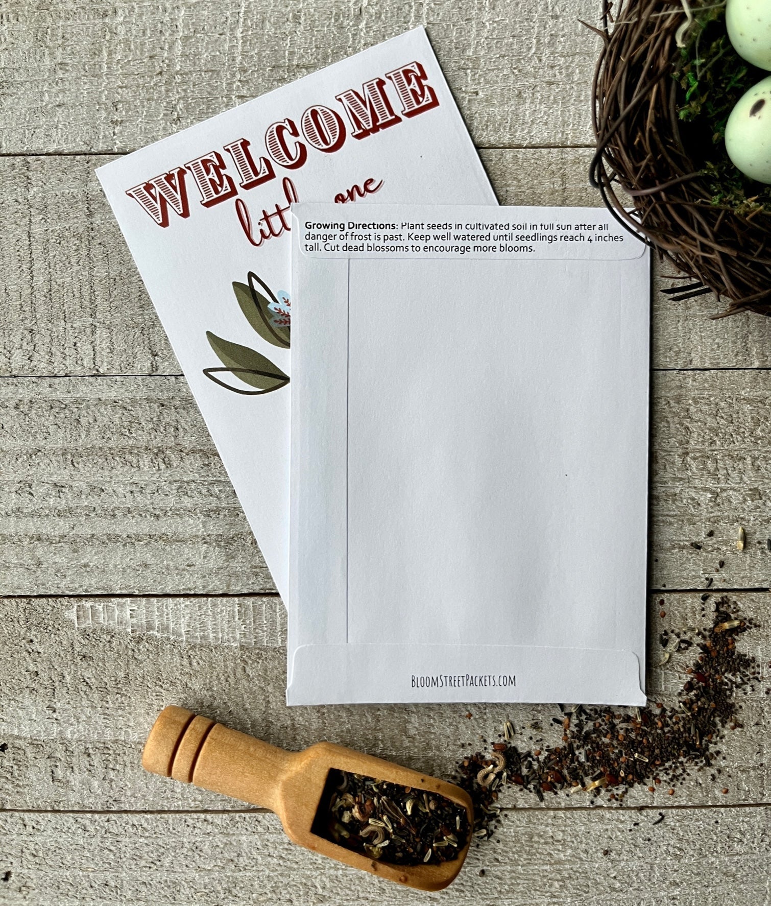 Celebrate your newborn with Welcome Little One Seed Packets. Each packet contains 200–300 bee-friendly wildflower seeds and features delicate watercolor flowers in soft pinks and greens. Customizable with your baby’s name and birthdate, these eco-friendly favors make a thoughtful keepsake for baby showers or birth announcements, symbolizing growth, beauty, and new beginnings.